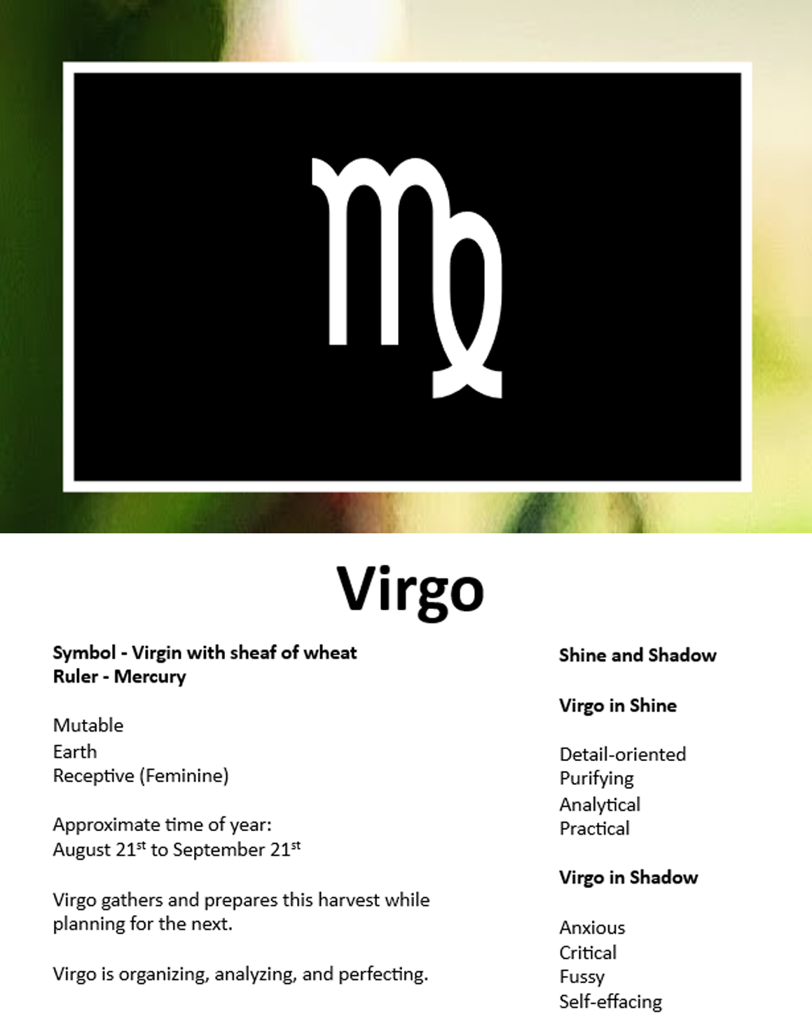 • Virgo: Virgo is organizing, analyzing, and perfecting.