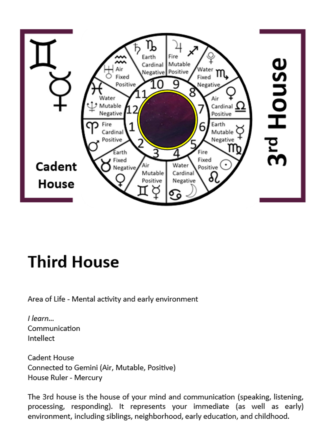 1. Learn about the function of houses in natal charts. Learn about the house themes. Find your Sun’s house placement and the themes of that house.